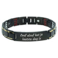 De armband is gemaakt van hoogwaardig roestvrij staal in de kleursamenstelling zwart en goud. Het middelste gedeelte van de armband biedt ruimte voor jouw eigen bijzondere tekst of symbool. Zo maak je het cadeau extra persoonlijk en speciaal!