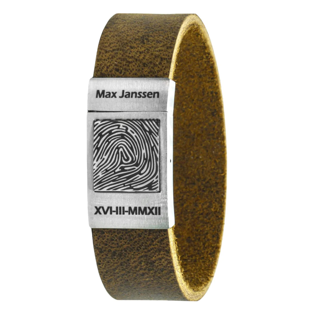 Maak je eigen persoonlijke armband met jouw vingerafdruk erop gegraveerd. Eigen gravure van je vingerafdruk op de armband zorgt voor een unieke look! Daarnaast kun je zelf de kleur van het leder bepalen. Zo kun je kiezen tussen een zwarte, (licht)bruine of grijze tint. Naast deze kleuren, kun je er ook voor kiezen om te gaan voor bijvoorbeeld een zwart, bruin of cognac gevlochten leer. Je kunt ook je eigen tekst boven of onderop het sieraad laten graveren.