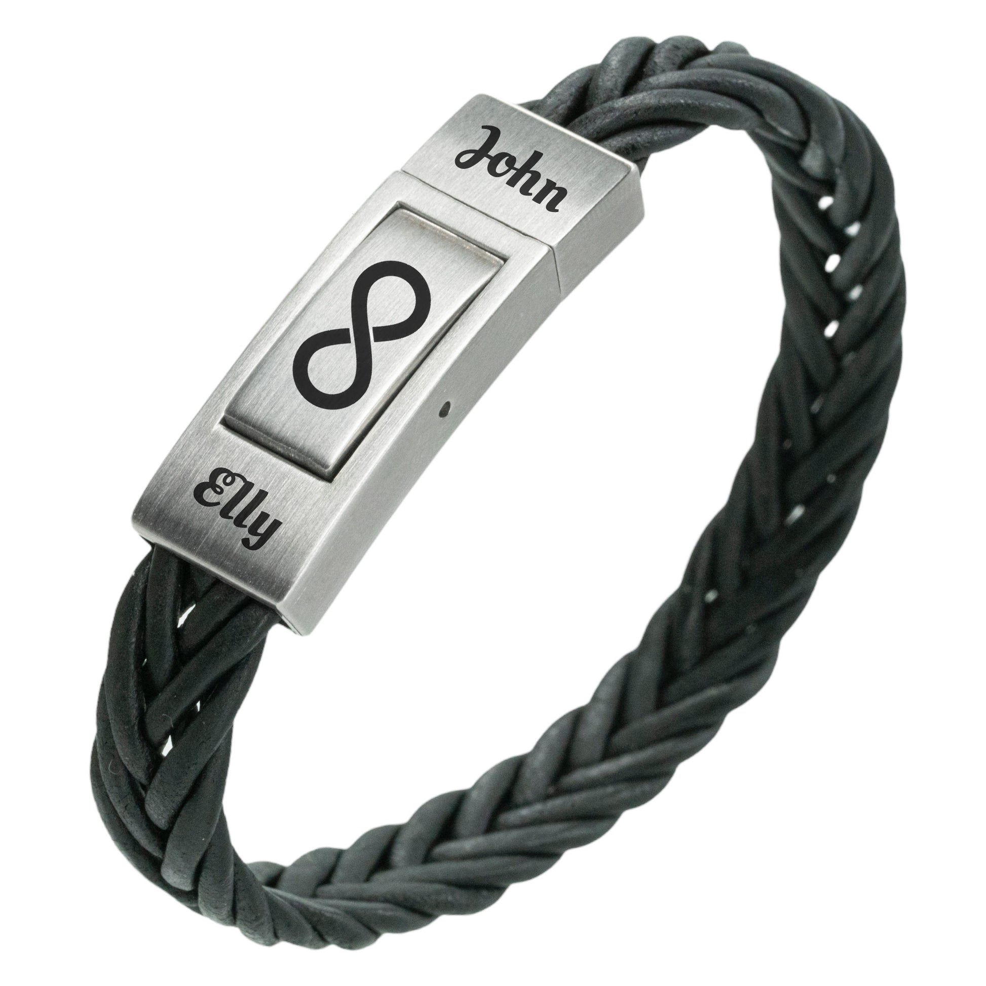 Op zoek naar een stijlvolle en gepersonaliseerde armband? Dan is onze drukschakelaar met eigen tekst gravure - gevlochten zwart leer perfect voor jou! Deze prachtige armband is gemaakt van hoogwaardig zwart edelstaal en heeft een unieke gevlochten leren band.