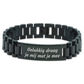 Op zoek naar een stijlvol sieraad dat helemaal bij jou past? Dan is deze zwarte multischakel armband met eigen tekst gravure perfect voor jou! Het sieraad heeft een prachtige uitstraling en is voorzien van unieke karakteristieke vormen. Bovendien kun je de armband personaliseren door er je eigen tekst aan toe te voegen.
